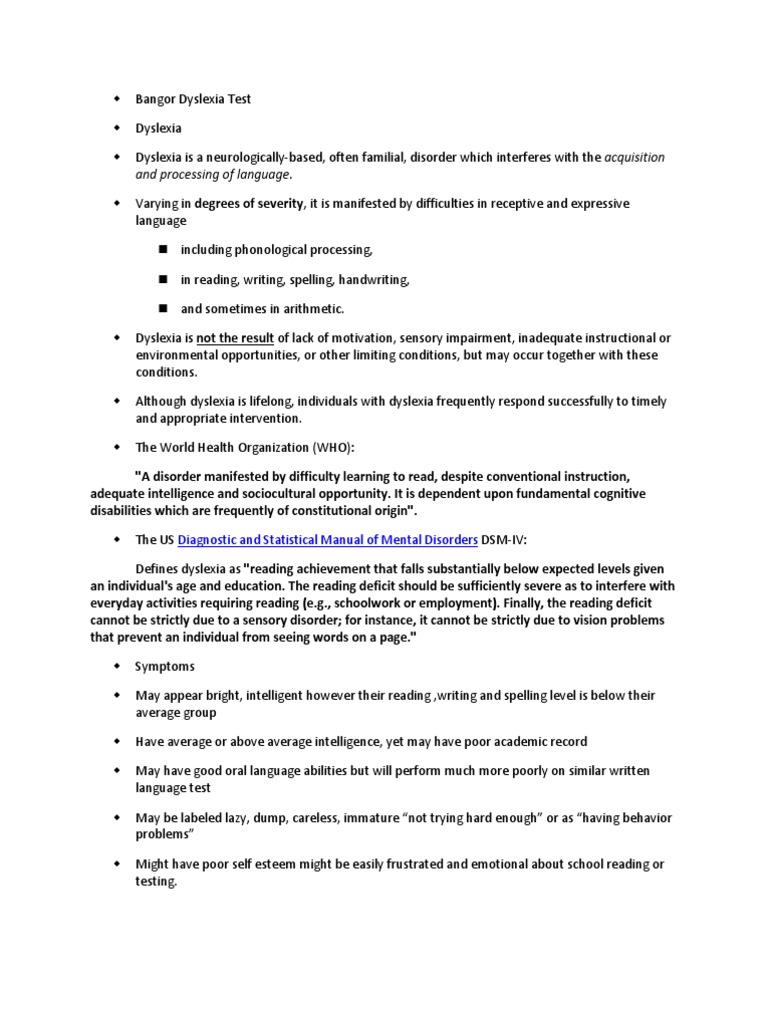Bangor Dyslexia Test Dyslexia Mental Disorder